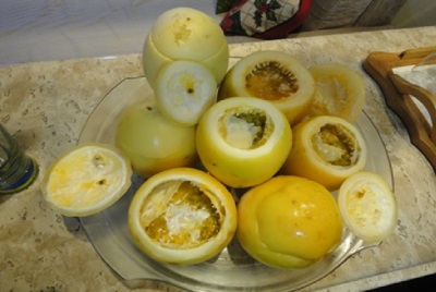 - Coloque dentro da fruta, o leite condensado e a bebida.