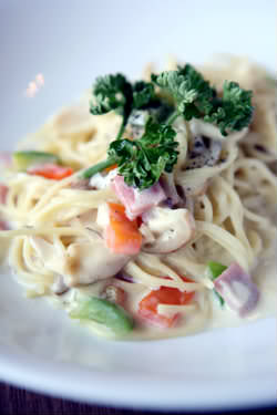 Espaguete com molho de creme de leite, salsicha, milho e queijo minas. Uma delícia!